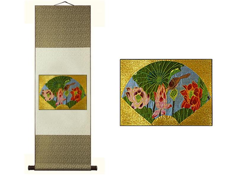 名称:金宝底荷塘月色 尺寸:26*37cm 材料:100%桑蚕丝 寓意:蚕丝底的荷塘月色,此款为蚕丝底荷塘月色卷轴,荷花是圣洁的代表,更是佛教神圣净洁的象征。出淤泥而不染,寓意品德高尚。宜贡坊将云锦工艺与荷花图案结合,体现了中华艺术魅力!