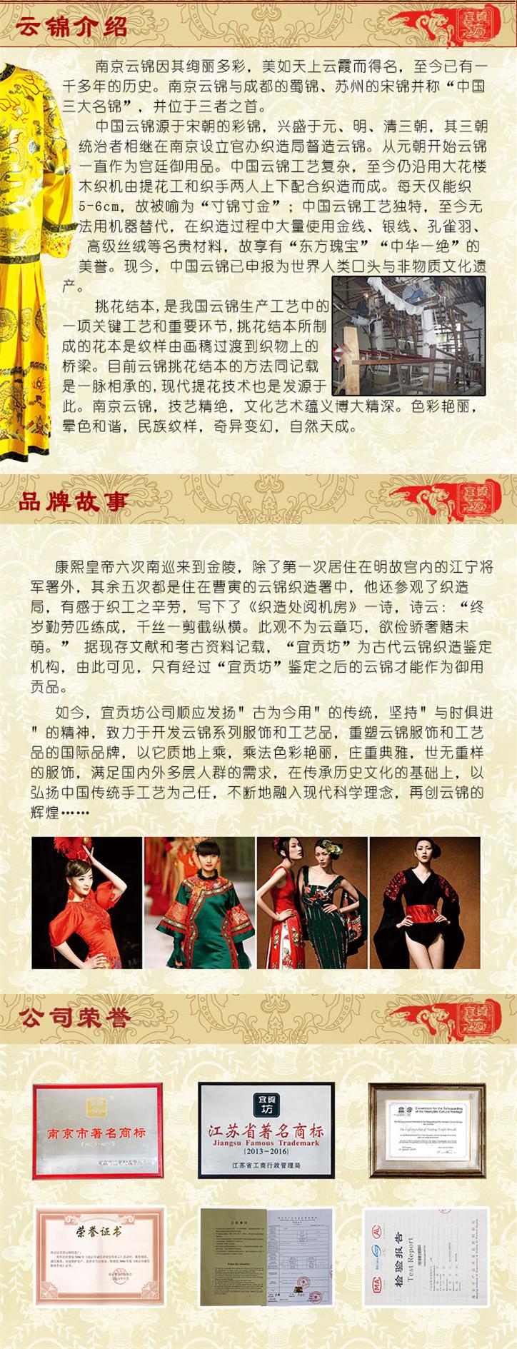 南京宜贡坊云锦织造厂成立于二OO一年,场地面积10000㎡,致力于做中国知名的云锦,厂区座落于江宁开发区,作为江苏大型云锦厂家之一,南京宜贡坊拥有雄厚的技术力量和实力,现有大型传统花木楼织机几十台,织造师、研究设计人员数百人。了解更多工厂信息>>