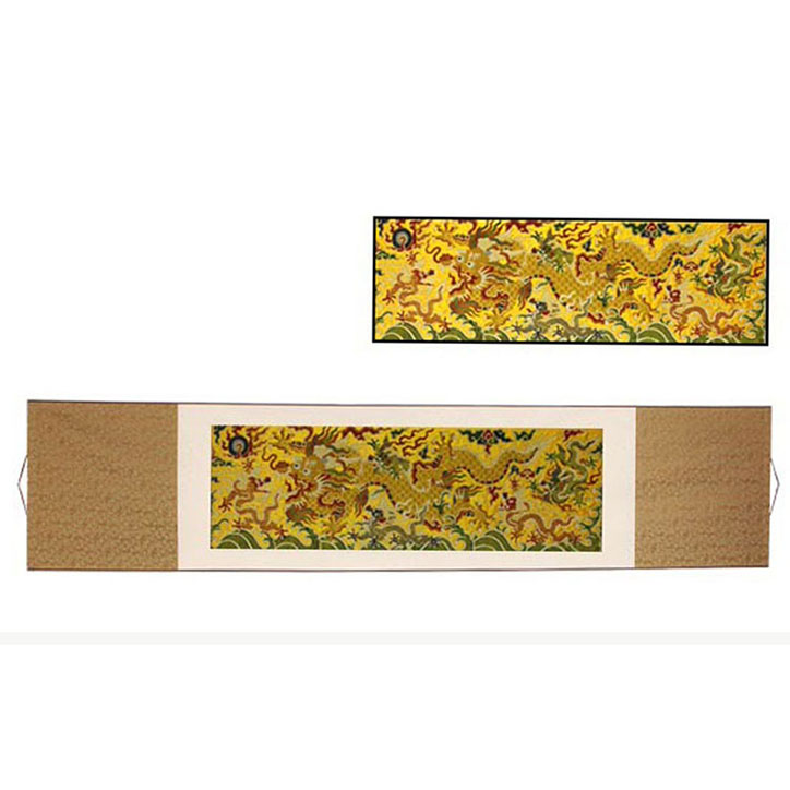 大号 34*93cm 48*177cm材料:100%桑蚕丝寓意:子孙龙卷轴,里面一条大龙带着几条他的儿孙龙,寓意儿孙满堂,其乐融融,此款卷轴共有六条龙,取名中华子孙龙,寓意至尊至贵,是家居摆设及商务馈赠佳品。